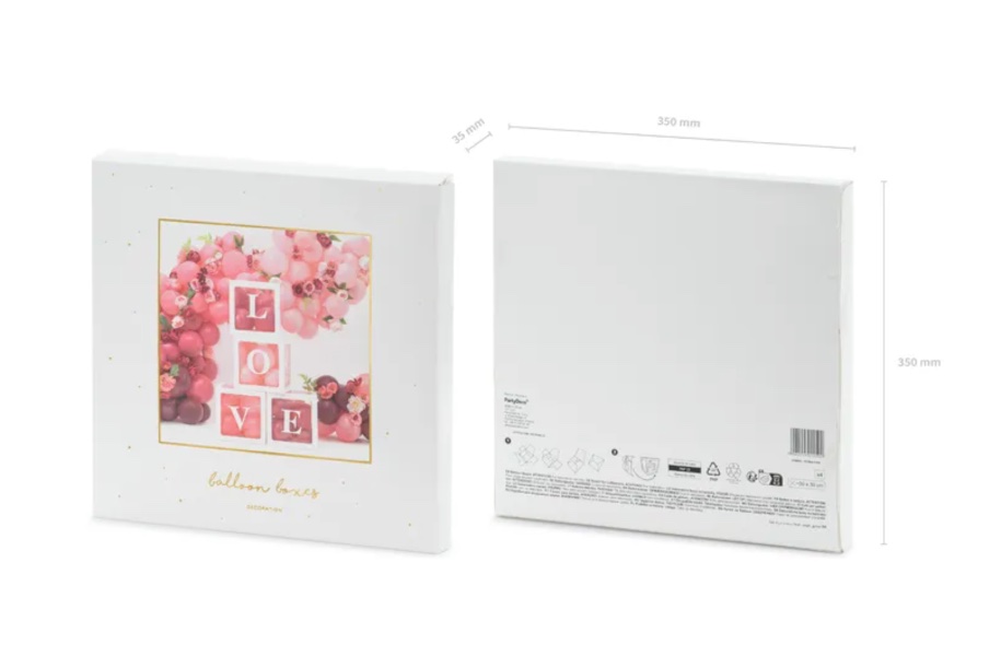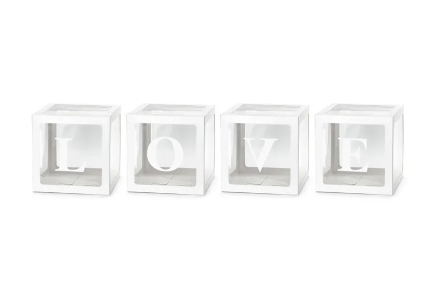 • 1 x zestaw 4 pudełek na balony oraz naklejane literki LOVE w kolorze białym. Produkt do samodzielnego złożenia. Wymiary 30 x 30 cm.