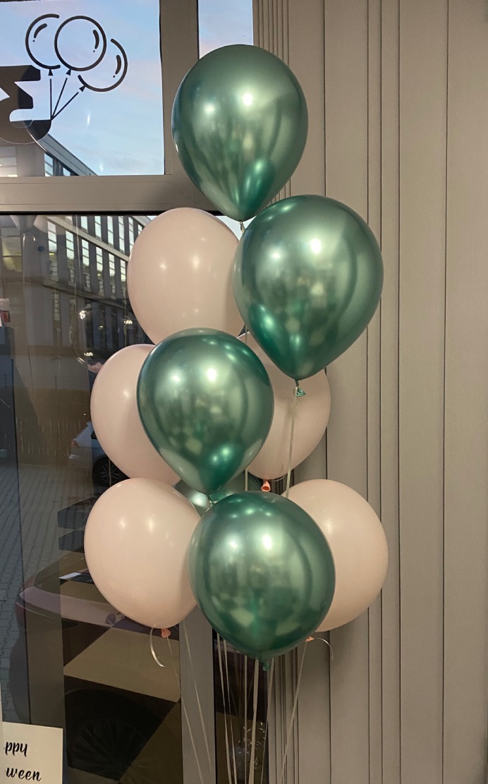 • 5 x balon lateksowy, kolor zielony glossy, rozmiar 30 cm z helem + wstążki.
