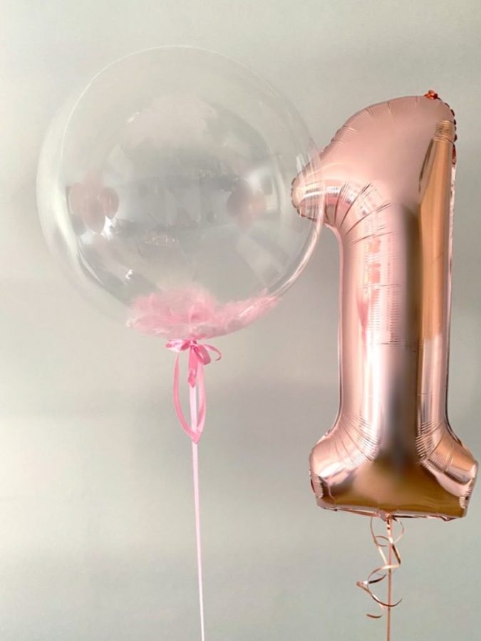 Balon bubble wypełniony różowymi piórkami z cyfrą 1