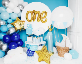 • 1 x balon foliowy cyfra „1” w kolor błękit, rozmiar 90 cm + wstążka ~1,5 m.
