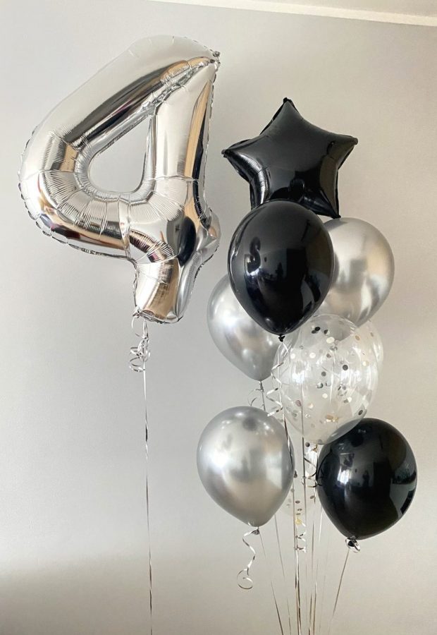 Balon cyfra srebrna w bukiecie z balonami w kolorze czarnym i srebrnym