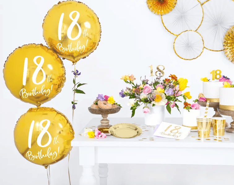 • 1 x okrągły balon foliowy z napisem 18th Birthday, rozmiar 45 cm z helem + wstążka ~1,5 m.