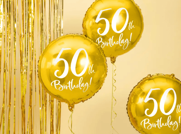 • 1 x okrągły balon foliowy z napisem 50th Birthday, rozmiar 45 cm z helem + wstążka ~1,5 m.