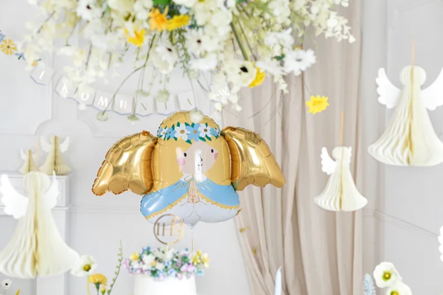 Dodaj odrobinę magii i delikatności do swojej uroczystości dzięki uroczej dekoracji – balonowi foliowemu w kształcie aniołka o imponującym rozmiarze 103 cm! Wypełniony helem unosi się w powietrzu, tworząc subtelny i elegancki akcent na chrzcinach, komunii czy świątecznych przyjęciach. Jego starannie wykonane detale i miękkie kolory sprawiają, że idealnie komponuje się z innymi dekoracjami, podkreślając wyjątkowy charakter wydarzenia. To doskonały wybór dla tych, którzy chcą dodać swojej aranżacji niebiańskiego uroku i ciepłej atmosfery!