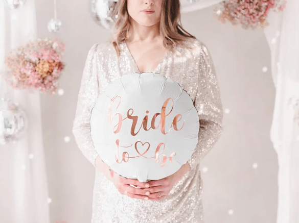 • 1 x balon foliowy biały z napisem „bride to be”, rozmiar 45 cm z helem + wstążka ~1,5 m.