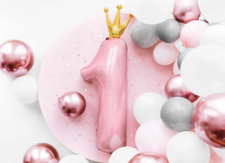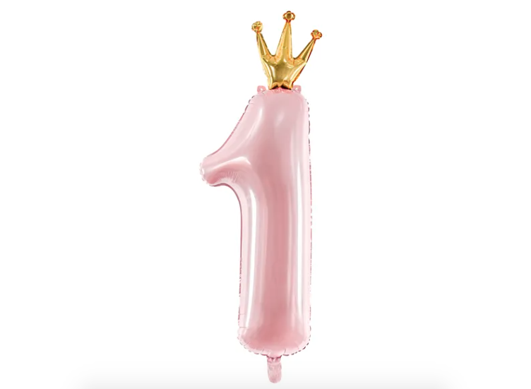 • 1 x balon foliowy cyfra „1” w kolor różowym, rozmiar 90 cm + wstążka ~1,5 m.
