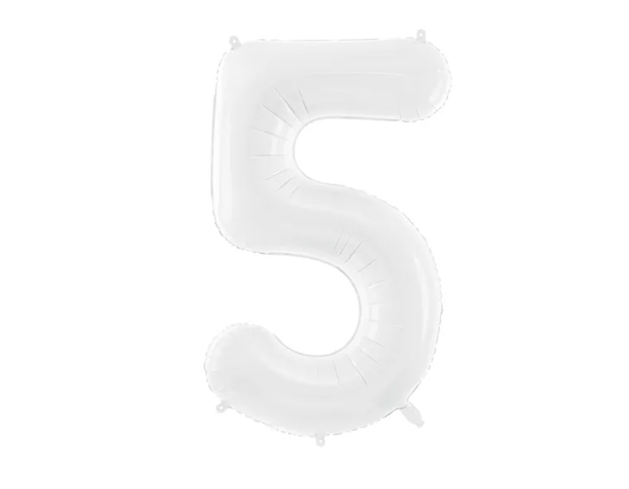 • 1 x balon foliowy w kształcie cyfry 5, kolor biały, rozmiar ~90 cm z helem + wstążka ~1,5 m.