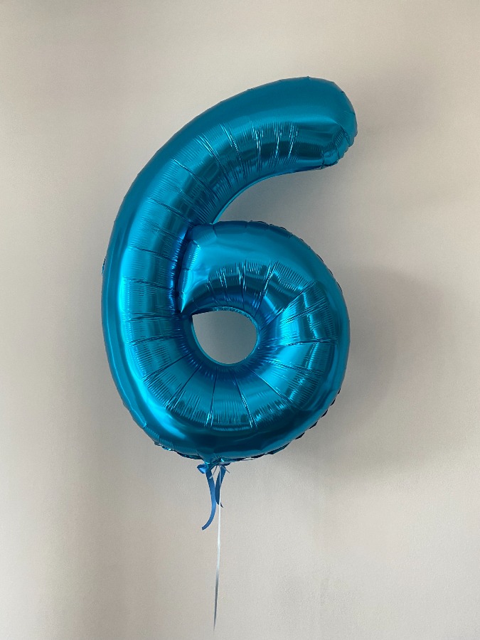 • 1 x balon foliowy w kształcie cyfry 6, kolor niebieskim, rozmiar 90 cm z helem + wstążka ~1,5 m.