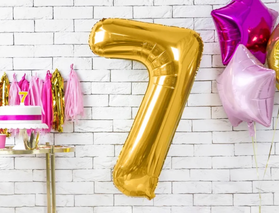 • 1 x balon foliowy cyfra 7, kolor złoty, rozmiar 100 cm z helem + wstążka ~1,5 m.