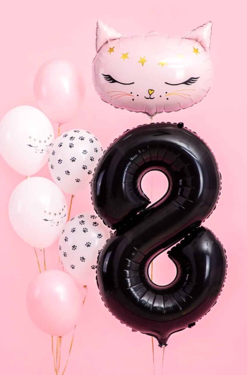 • 1 x balon foliowy cyfra 8, kolor czarny, rozmiar 100 cm z helem + wstążka ~1,5 m.