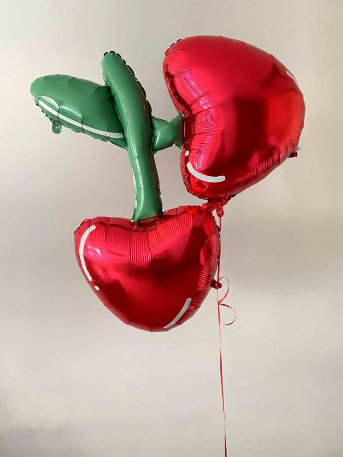 • 1 x balon foliowy wiśnie z helem, rozmiar 88 cm + wstążka ~1,5 m.