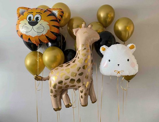 • 1 x balon foliowy żyrafa, rozmiar 120 cm z helem + wstążka ~ 1,5 m.