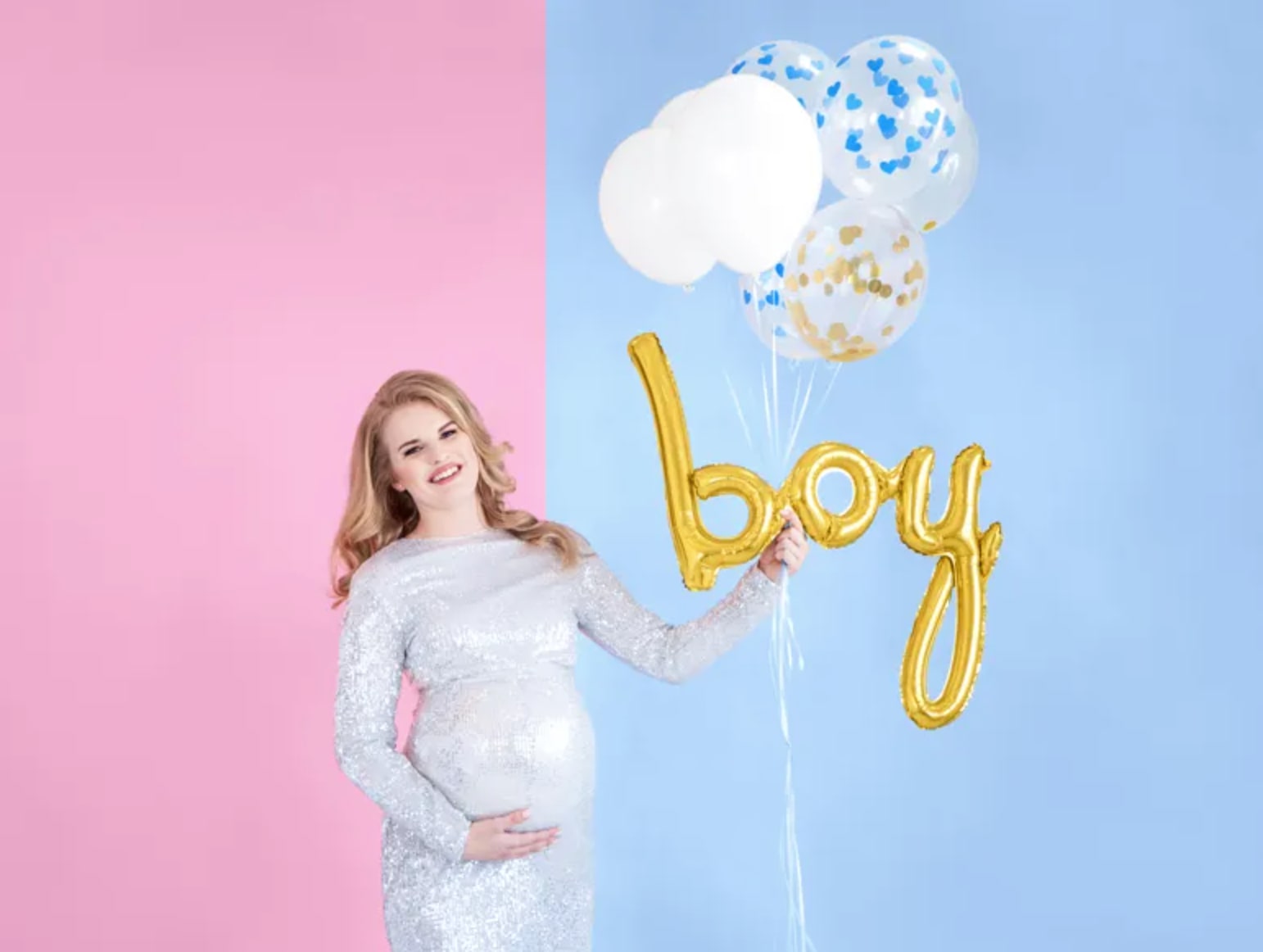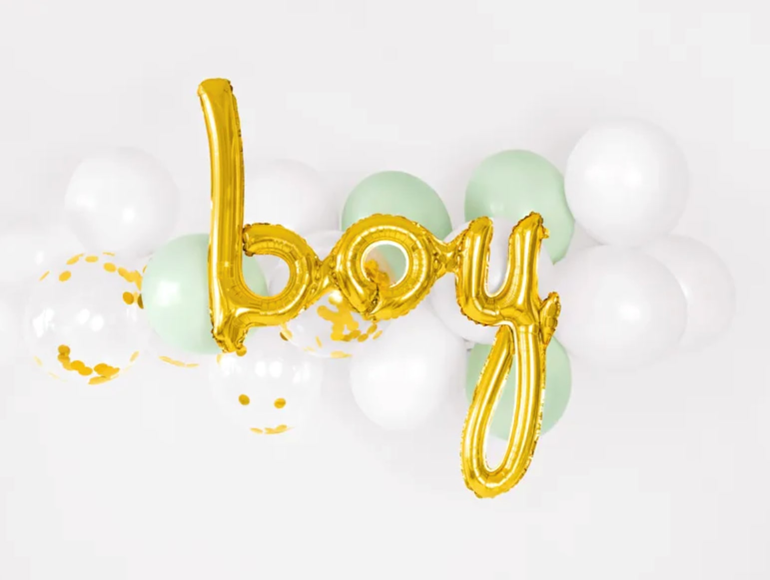 • 1 x balon foliowy boy, wypełniony zwykłym powietrzem, kolor złoty, rozmiar ~63,5 x 74 cm + wstążka.