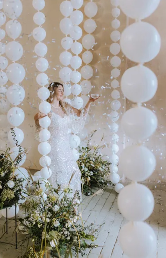 • 1 x balon lateksowy z łącznikiem, kolor biały, rozmiar 33 cm + wstążka ~1,5 m.