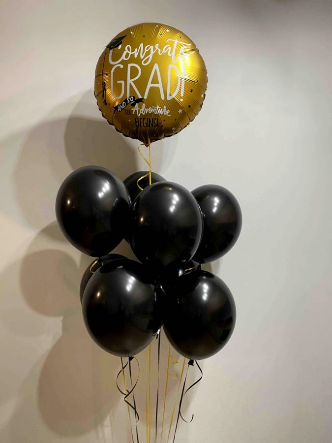 • 1 x okrągły balon foliowy „Congrats GRAD! And so the adventure begins!” z helem, rozmiar 45 cm + wstążka ~1,5 m.
