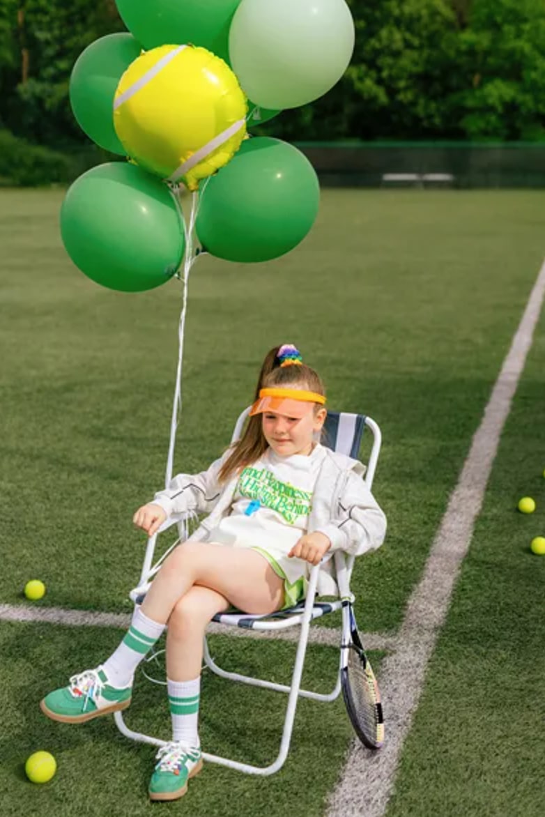 • 1 x balon foliowy piłka tenisowa. Wymiary przed napompowaniem ok 45 x 45 cm (18 x 18”). Wymiary po napompowaniu ok 35 x 35 cm (14 x 14”) + wstążka ~1,5 m.