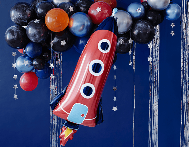 • 1 x balon foliowy rakieta, rozmiar 115 cm + wstążka ~1,5 m.
