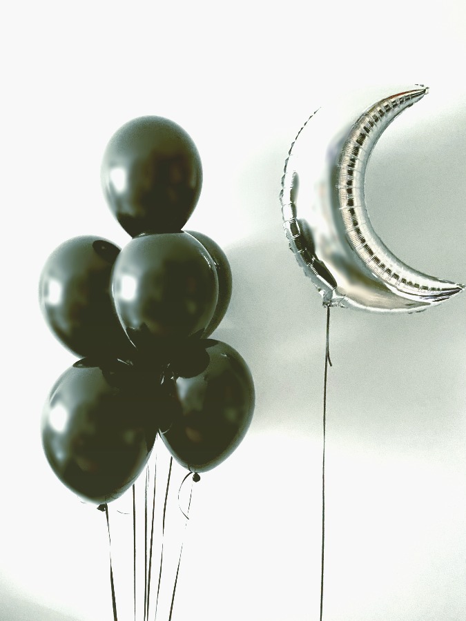 • 1 x balon foliowy w kształcie księżyca, rozmiar 70 cm, kolor srebrny z helem + wstążka ~1,5 m.