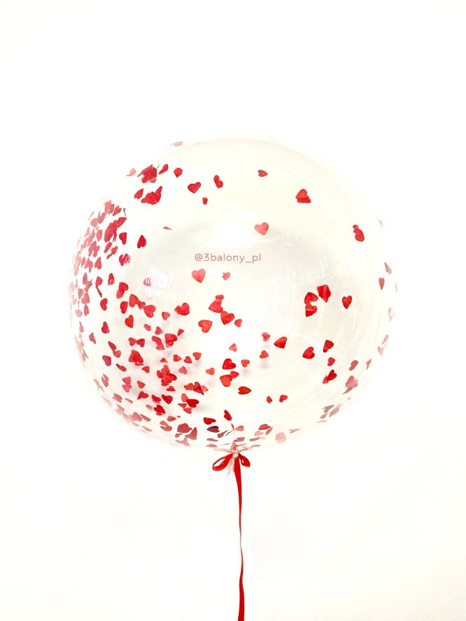 • 1 x balon bubble wypełniony czerwonymi sercami, rozmiar ~50 cm z helem + wstążka ~1,5 m.