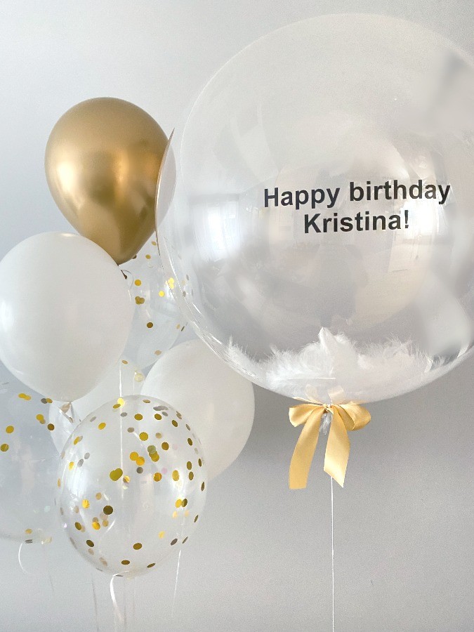 • 1 x okrągły balon bubble z helem oraz białymi piórkami, rozmiar ~50 cm (napis opcjonalnie);