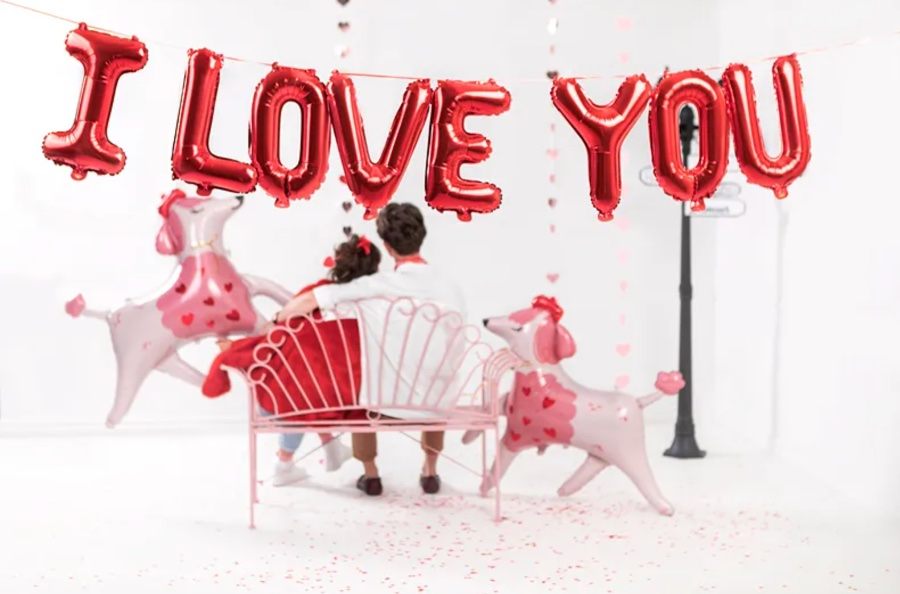 • 1 x balony foliowe literki, napis I love you, kolor czerwony, rozmiar 260×40 cm (na sznurek).