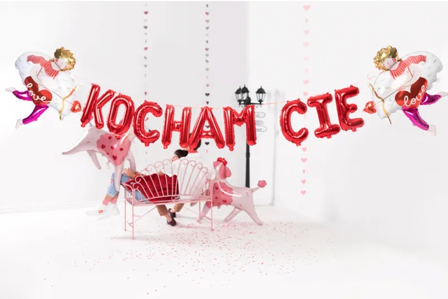 • 1 x balony foliowe literki, napis Kocham Cię, kolor czerwony, rozmiar 285 x 40 cm (na sznurek) wypełnione powietrzem.