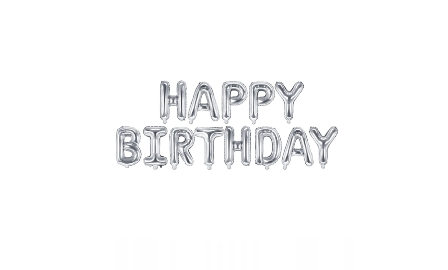 • 1 x balon foliowy napis HAPPY BIRTHDAY srebrny, rozmiar wysokości 40 cm, wypełniony powietrzem + wstążka.