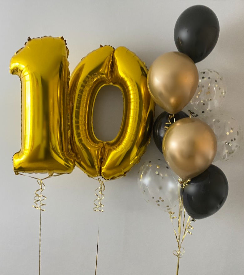 • 1 x balon foliowy cyfra 1 i 0, kolor złoty, rozmiar 100 cm z helem;