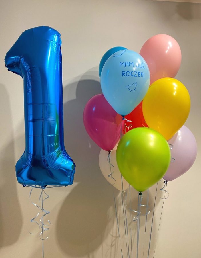 • 1 x balon gumowy z nadrukiem „MAM JUŻ ROCZEK”, rozmiar 30 cm z helem;