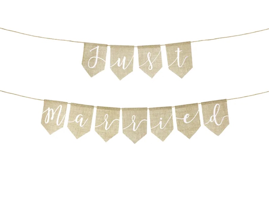 • 1 x baner wykonany z juty z białym napisem Just married, baner składa się z dwóch części o wymiarach: Just – wysokość ok. 23 cm, długość ok. 65 cm, married – wysokość ok. 23 cm, długość ok. 120 cm.