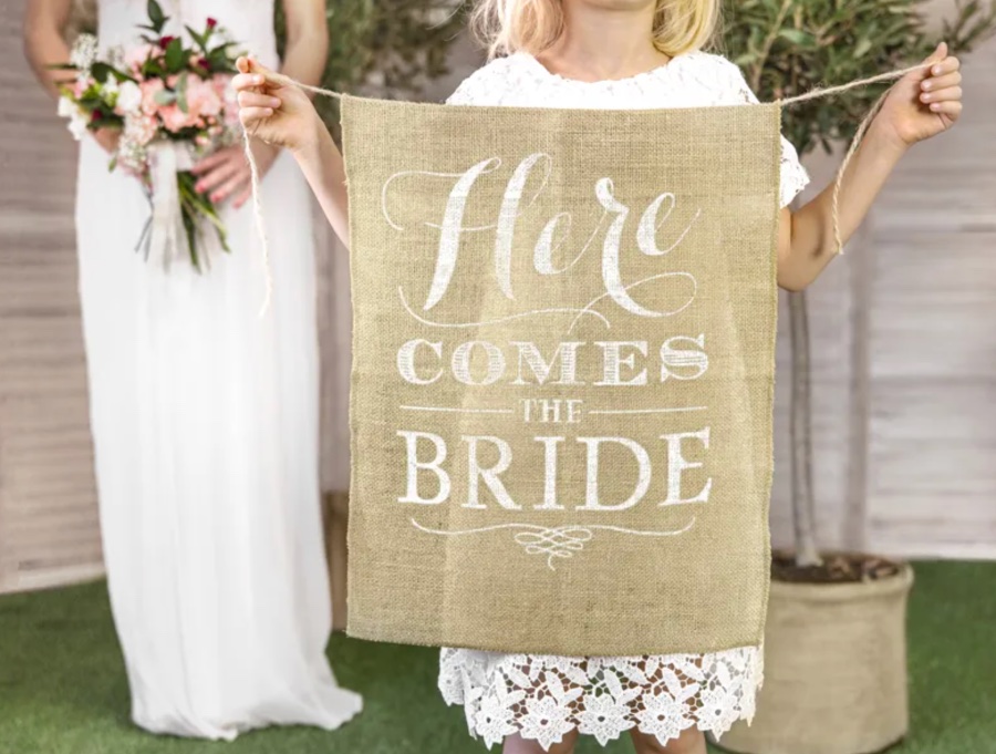 • 1 x baner na przejście Panny młodej wykonany z juty, z białym napisem Here comes the bride, rozmiar 41 x 51 cm.
