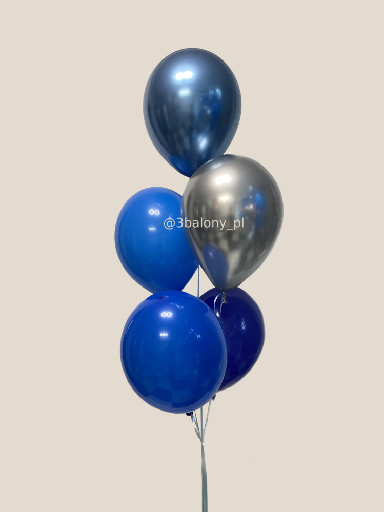 Balonowy bukiet zawiera 1 balon lateksowy glossy w kolorze niebieskim, napełniony helem, który nadaje elegancki i błyszczący efekt. Dodatkowo, w skład wchodzi 3 balony lateksowe w odcieniach niebieskiego (mix), również napełnione helem, które tworzą spójną kolorystycznie dekorację. W zestawie znajduje się także 1 balon lateksowy glossy w kolorze srebrnym, dodający odrobinę blasku. Całość dopełnia jeden ciężarek, który zapewnia stabilność balonów, tworząc efektowną dekorację na każdą uroczystość.