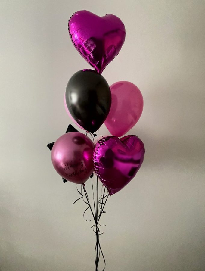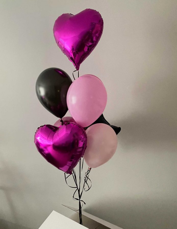 W skład całego zestawu wchodzą trzy balony foliowe – jeden w kształcie gwiazdy w czarnym kolorze oraz dwa w kształcie serca w głębokim malinowym kolorze. Całości dopełniają cztery duże lateksowe balony w kilku odcieniach różu oraz jeden balon lateksowy w głębokiej czerni. Wszystkie balony w zestawie zostały wypełnione helem. Balony można swobodnie doczepić do załączonego do zestawu ciężarka oraz pudełka o wymiarach 60×60 cm. Za dodatkową opłatą można dodać spersonalizowany napis oraz grafikę na wybranym przez siebie balonie. W cenie zestawu jest także bilecik z życzeniami wydrukowany na białej, sztywnej kartce.