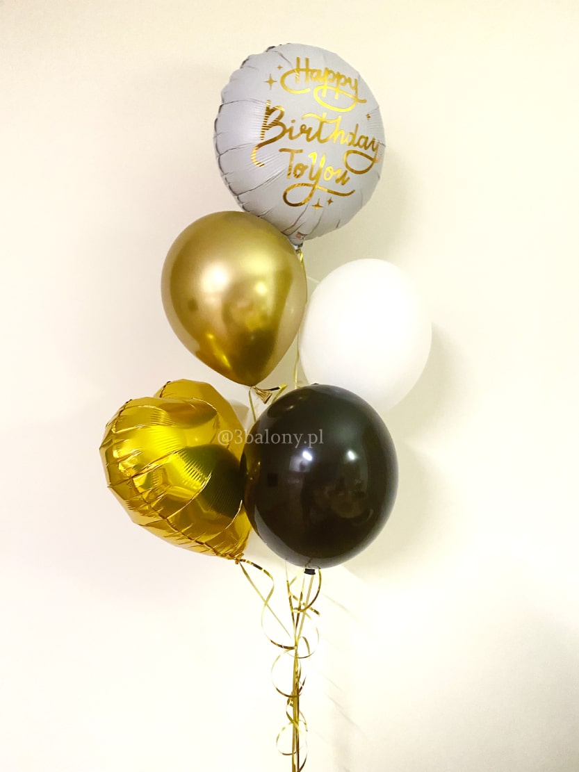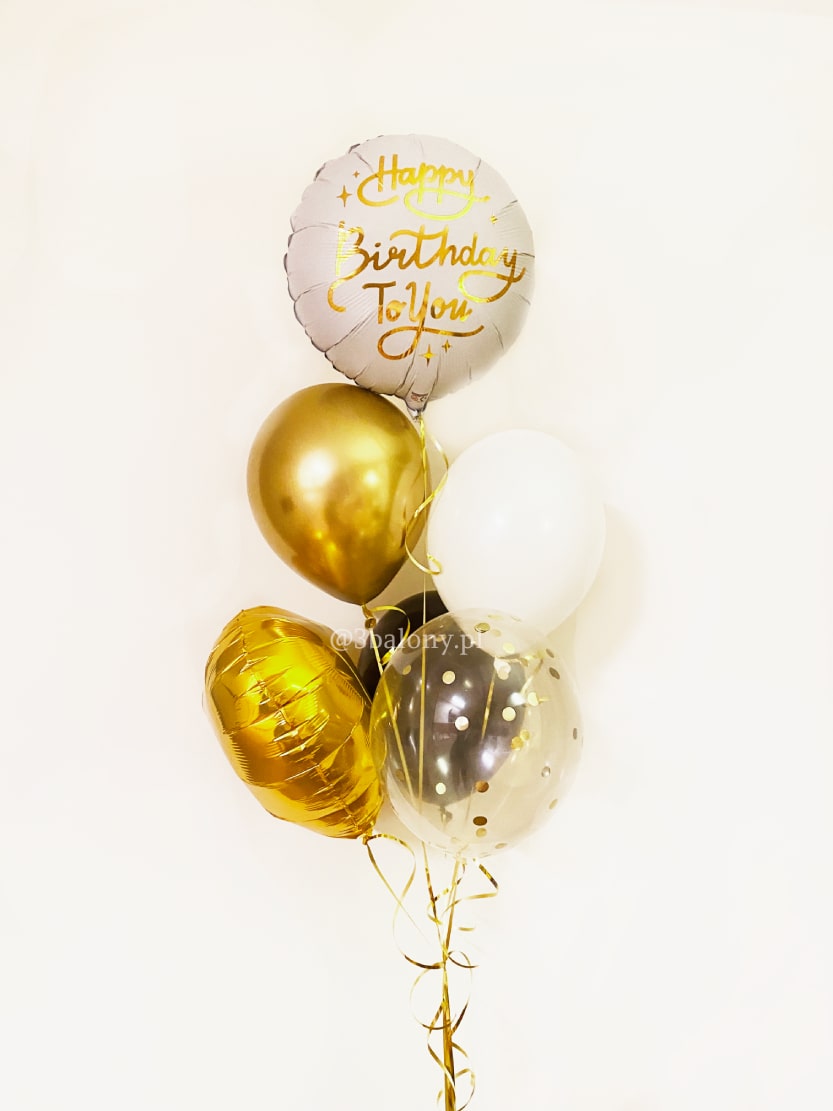 Bukiet sześciu balonów w złoto-białej kolorystyce, z napisem „Happy Birthday To You”