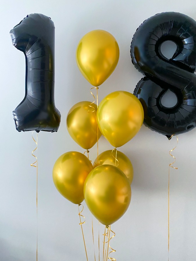 Wybierz naszą dekorację z cyfrą 18 w kolorze czarnym i bukietem balonowym w złotym kolorze i spraw, aby urodziny osoby, która kończy 18 lat, były wyjątkowe i niezapomniane!