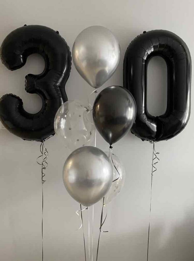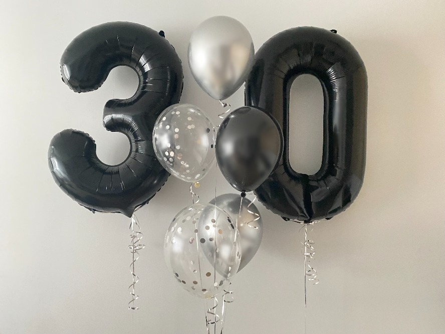 Cyfry 30 w czarnym kolorze z balonami w bukiecie