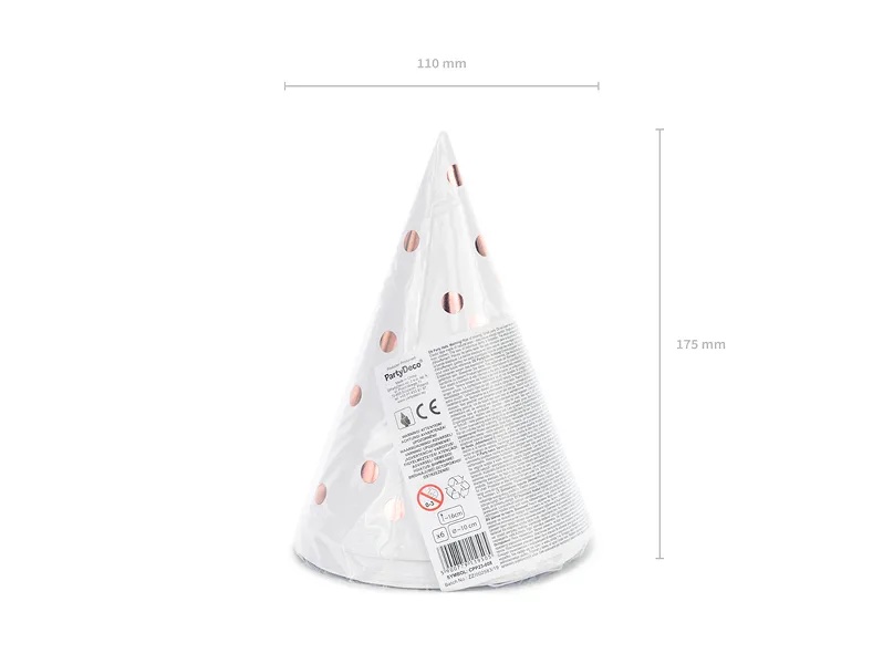 • 1 x czapeczki w kolorze białym ze wzorem w kropeczki w kolorze różowego złota, wysokość ok. 16 cm, średnica ok. 10 cm (1 op. / 6 szt.).