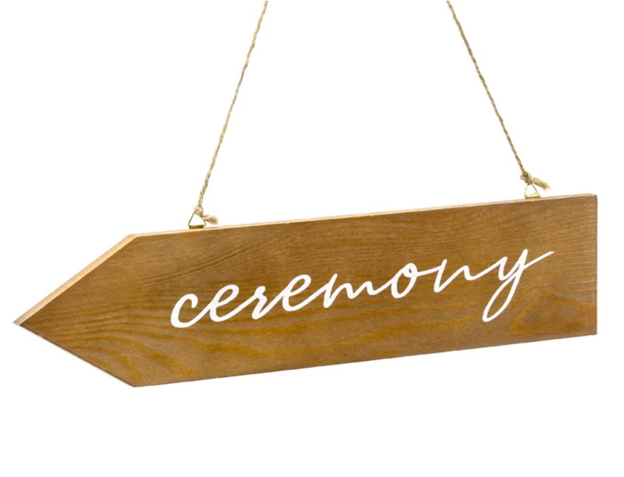 • 1 x dwustronny drogowskaz wykonany z drewna z białym napisem Ceremony, rozmiar tabliczki 36 x 7,5 cm, długość sznurka ok. 60 cm.