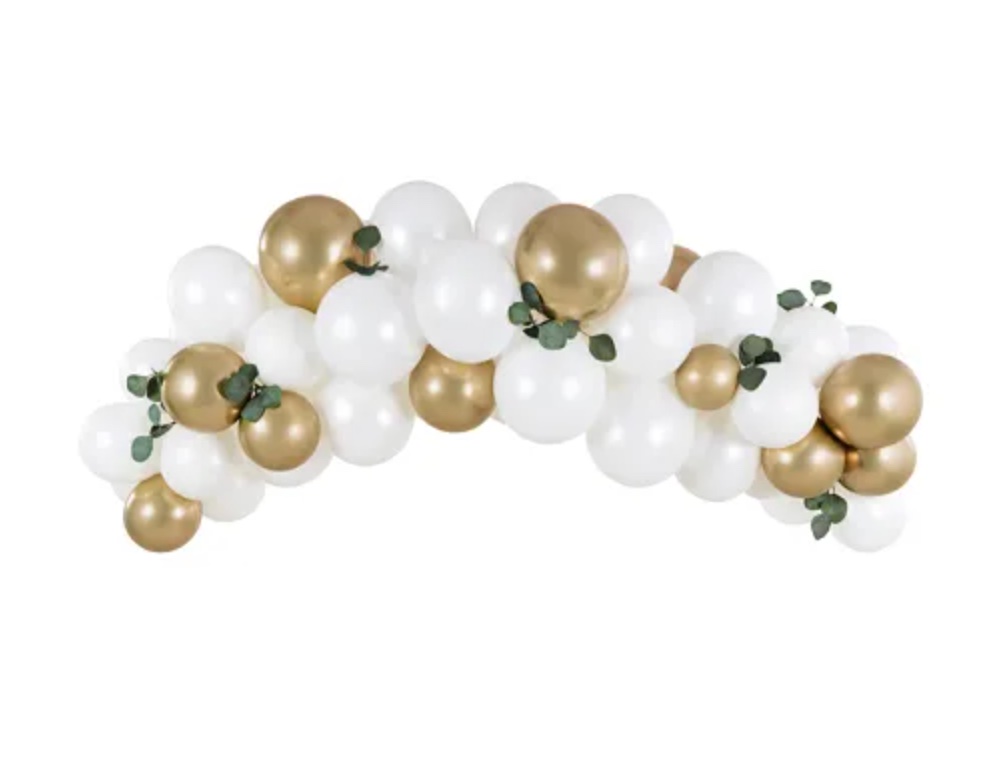 • 1 x girlanda balonowy w kolorze biało-złotym, długość ~200 cm + 3,5 m taśmy.