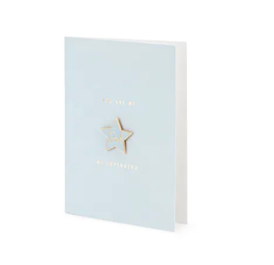 • 1 x kartka w niebieskim kolorze ze złotym metalizowanym nadrukiem z pinem w kształcie gwiazdki z napisem Dad i niebieską kopertą ze złotym metalizowanym nadrukiem, wymiary kartki ~ 10.5 x 14.8 cm, rozmiar ~3 x 3 cm.