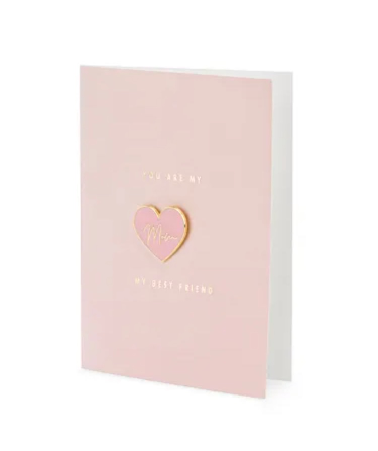 • 1 x kartka w różowym kolorze ze złotym metalizowanym nadrukiem z pinem w kształcie serca z napisem Mom i różową kopertą ze złotym metalizowanym nadrukiem, wymiary kartki ~ 10.5 x 14.8 cm, rozmiar ~3 x 2,7 cm.
