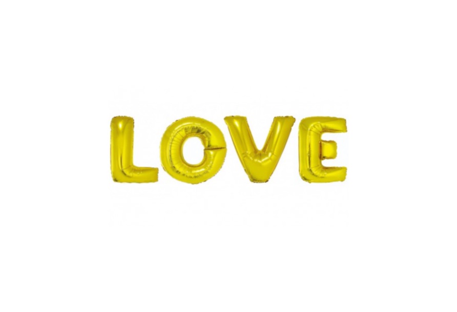• 1 x balon foliowa litera „L” „O” „V” „E”, kolor złoty, rozmiar 100 cm z helem.