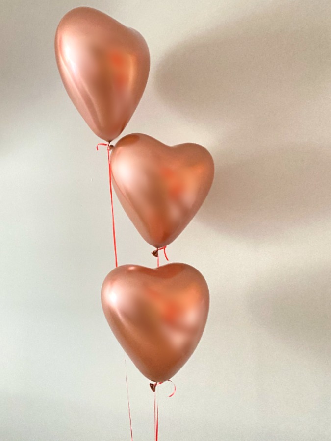 • 3 x balon lateksowy w kształcie serca, kolor glossy różowe złoto, rozmiar 30 cm z helem + wstążka ~1,5 m.