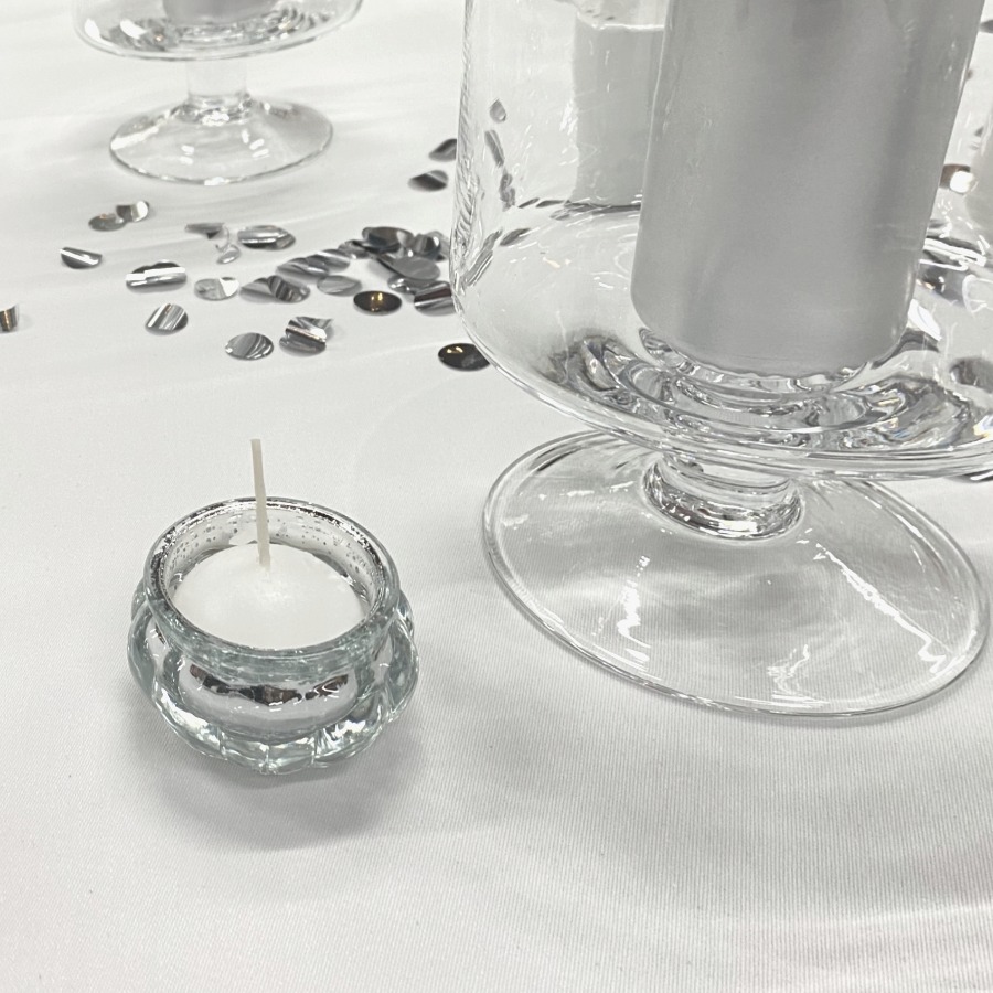 • 1 x szklany świecznik w kolorze srebrnym lustrzanym, szerokość ok. 6 cm, wysokość ok. 3 cm;