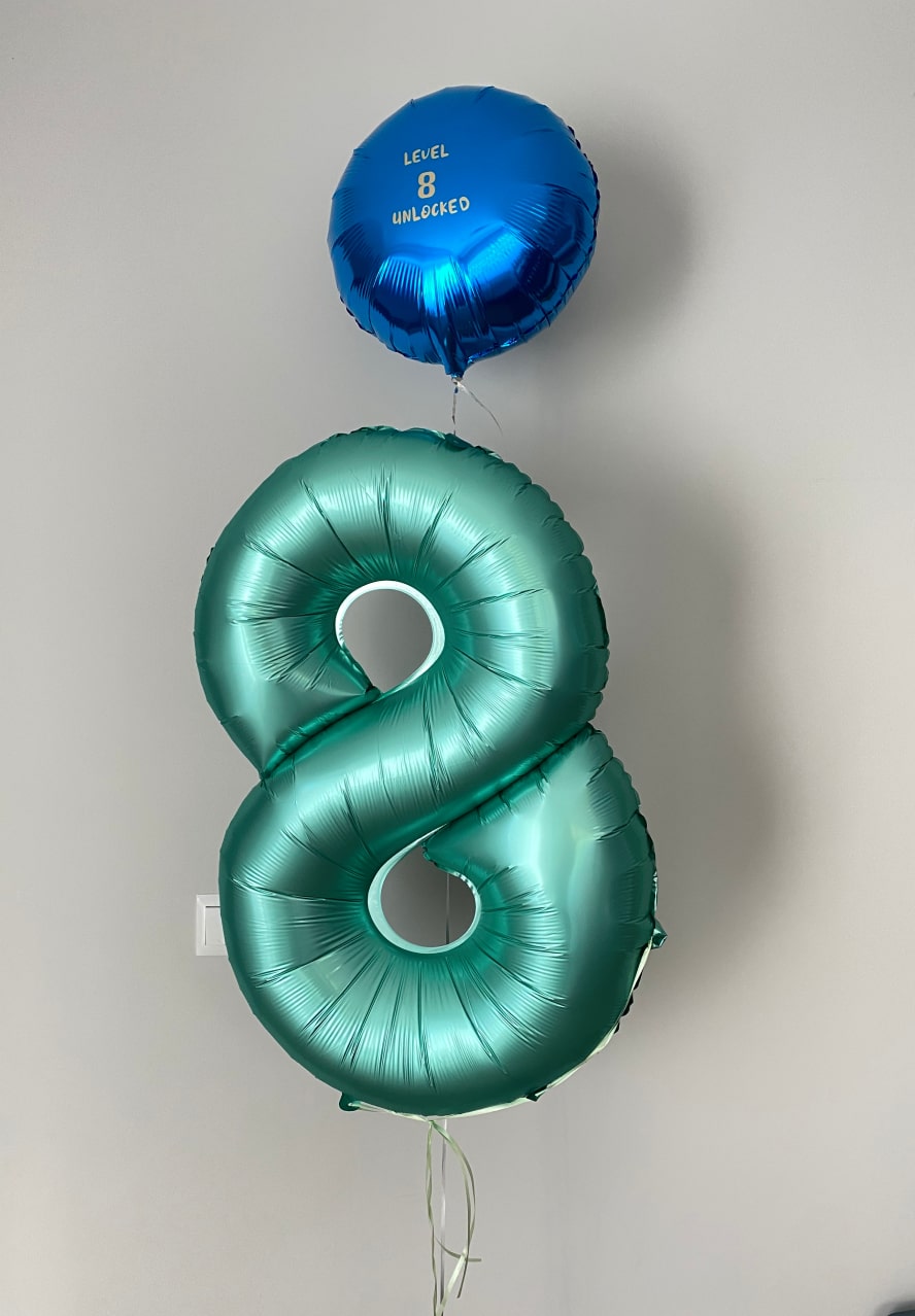 • 1 x balon foliowy niebieski, rozmiar 45 cm + napis Level 8 unlocked z helem + wstążka ~1,5 m.