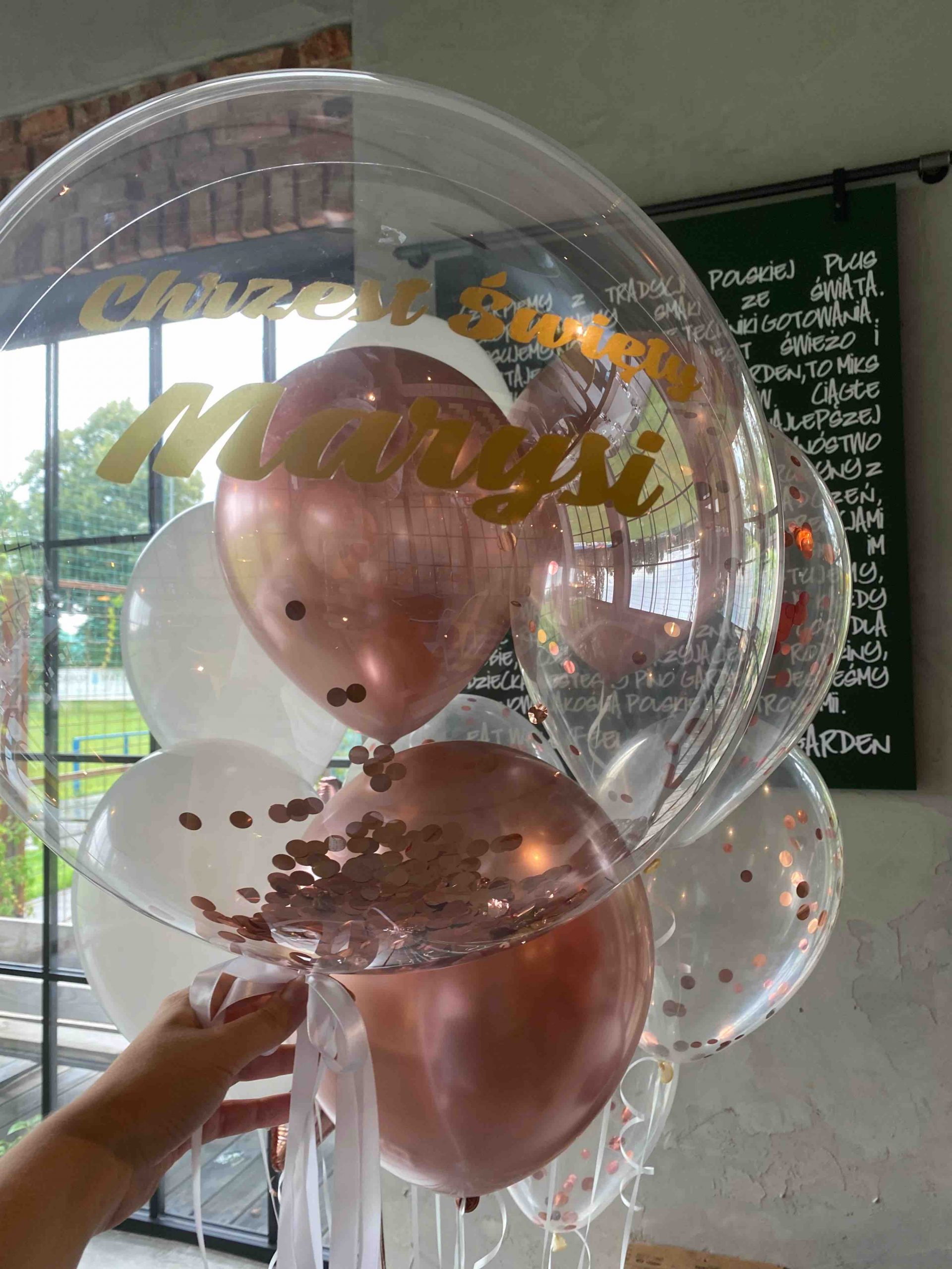 • 1 x balon okrągły wypełniony konfetti z helem (napis opcjonalnie);