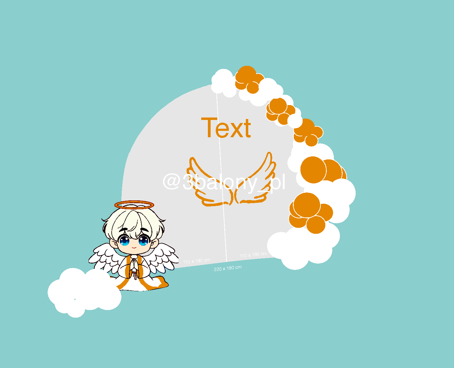 Elegancka, składana ścianka o wymiarach 220 x 180 cm, składająca się z dwóch części po 110 x 180 cm, stanowi idealne tło do wyjątkowych dekoracji – można na niej umieścić własny tekst lub rysunek, nadając aranżacji osobisty charakter. Girlanda balonowa, wykonana z balonów w dwóch harmonijnie dobranych kolorach, dodaje lekkości i uroku, a dopełnia ją delikatna, osobno umieszczona chmurka. Centralnym elementem kompozycji jest aniołek z trwałego PCV o grubości 3 mm, precyzyjnie wycięty po obrysie, dzięki czemu zachowuje elegancki kształt i sztywność. Całość tworzy bajkową, klimatyczną oprawę, doskonałą na wyjątkowe okazje.