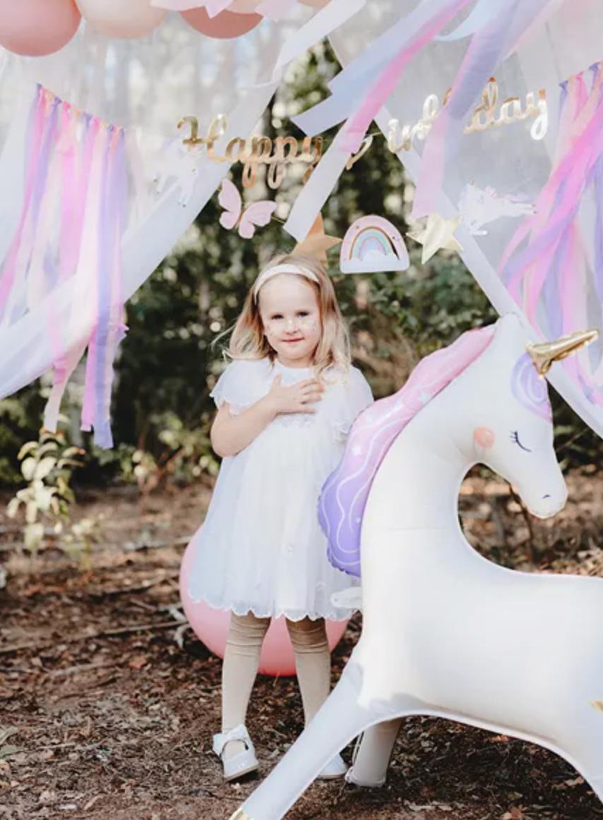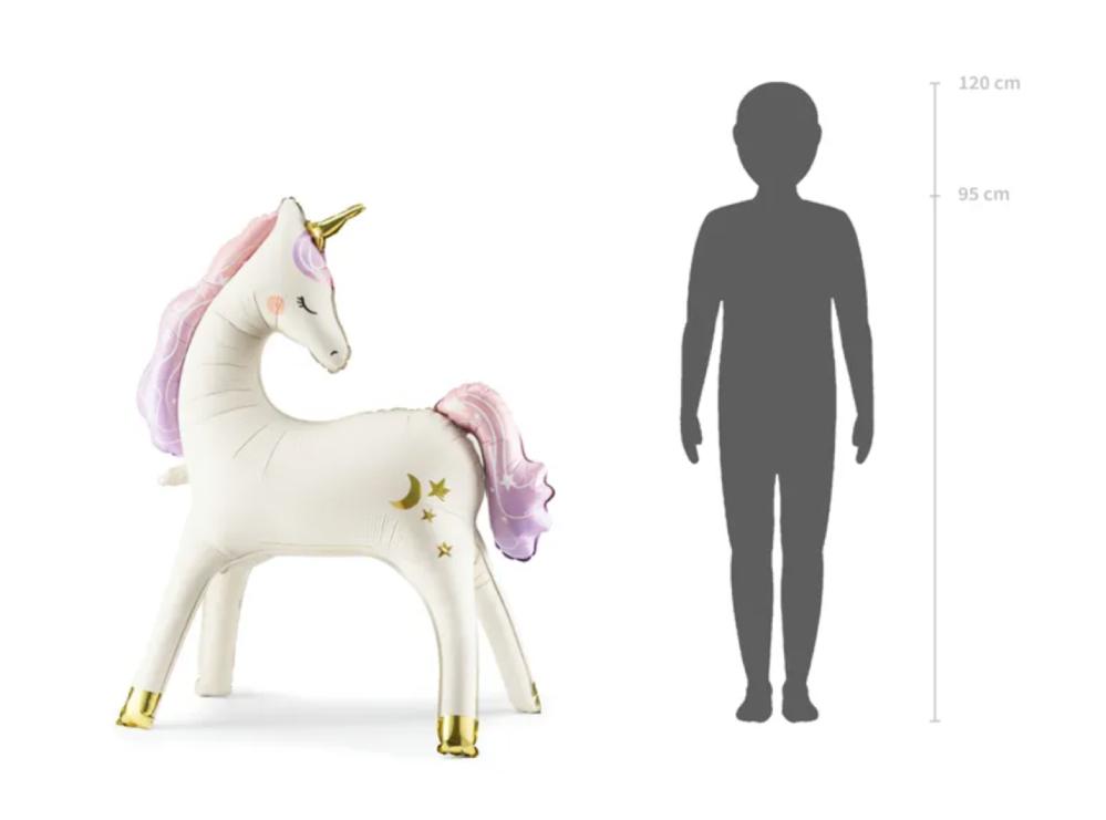 • 1 x balon foliowy stojący jednorożec, rozmiar przed napompowaniem 104 x 117 cm (41 x 46”), rozmiar po napompowaniu 95 x 86 cm (37.5 x 34”) z powietrzem.