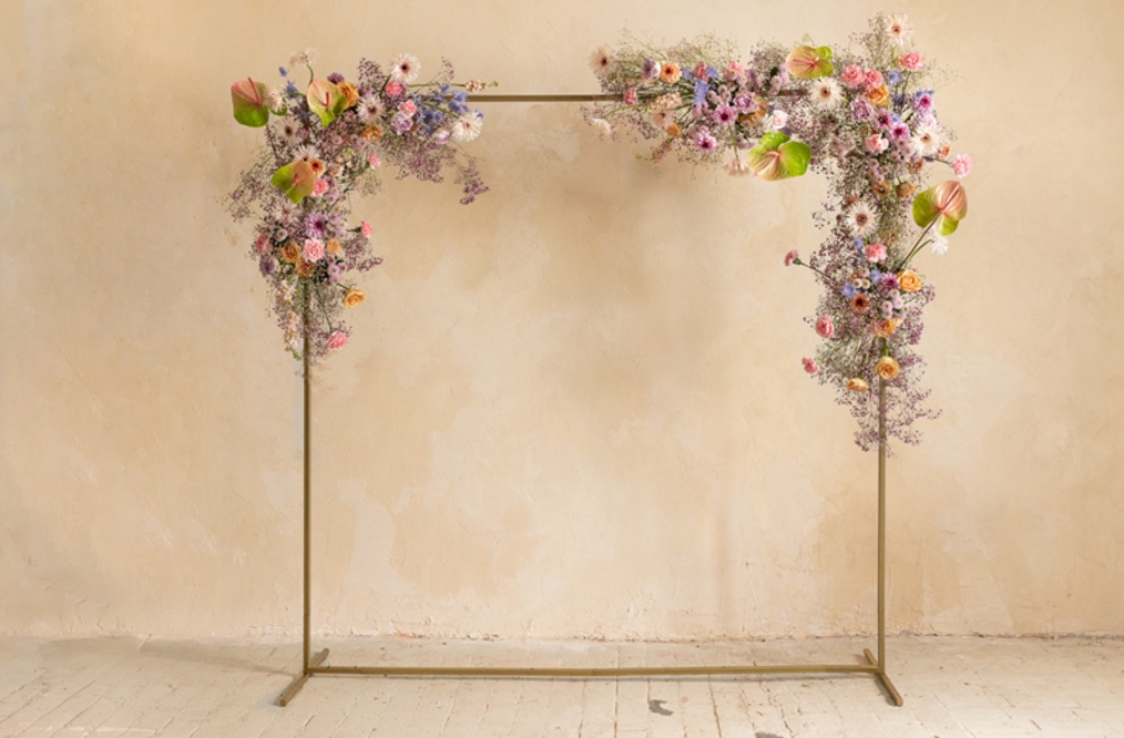 • 1 x stojak na tło w kształcie ramki, wykonany ze stali w kolorze złotym, z możliwością złożenia do dwóch wymiarów – 200×200 cm lub 120×120 cm. Produkt jest łatwy w montażu, a po złożeniu tworzy stabilną konstrukcję (wynajem 48 h).