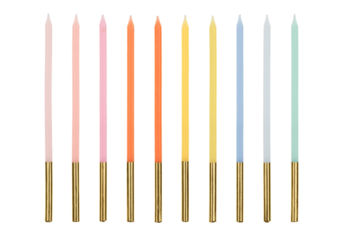 • 1 x świeczki urodzinowe gładkie, mix kolorów ze metalizowaną złotą końcówką, wysokość ok. 14 cm (1 op. / 10 szt.).